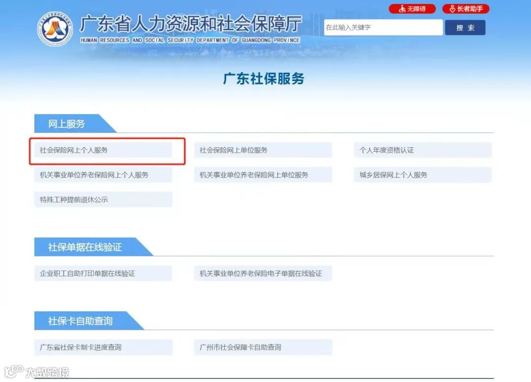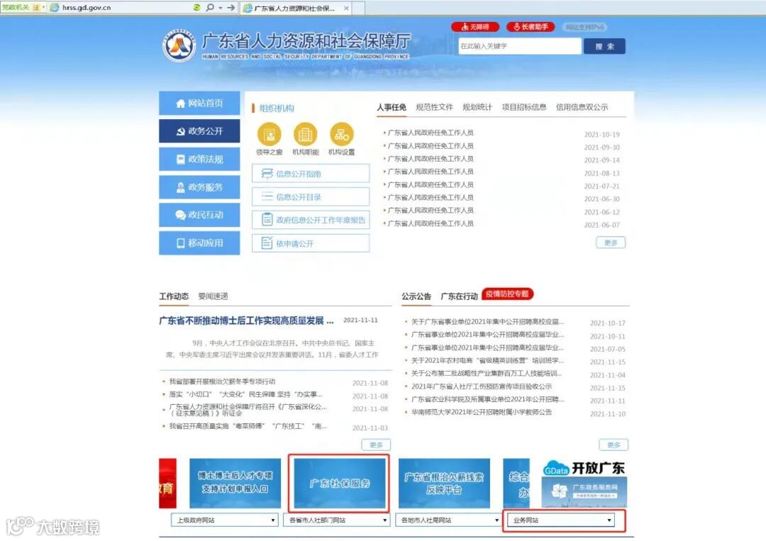 登录广东省人力资源和社会保障厅网站(hrss.gd.gov.cn),点击网页下方“广东社保服务”或“业务网站-广东社保服务”(如图)。