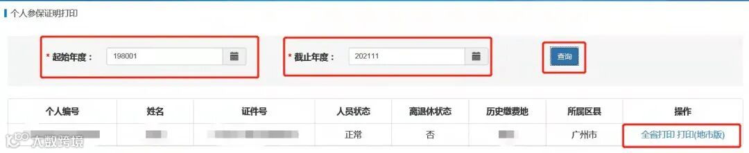 进入【广东省直社会保险参保证明(个人)】参保证明打印页面,选择起始年度、截止年度,点击查询,最后选择对应的记录点击【打印】即可。