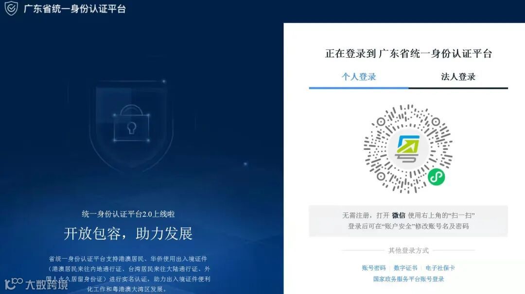 (2)广东省统一身份认证平台,默认采用公安人脸识别登录,使用手机微信扫描小程序扫描,在手机端进行人脸识别登录即可。