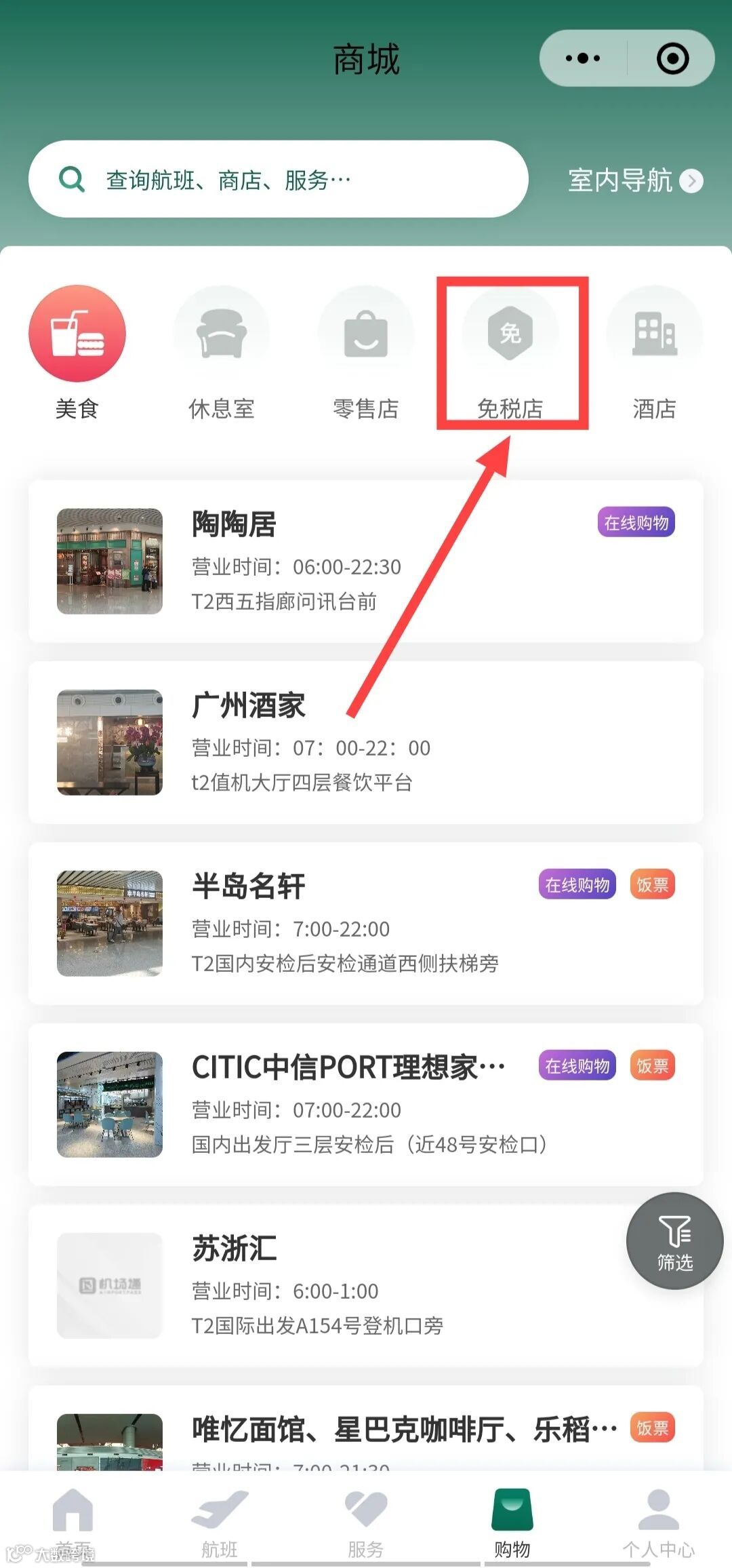 选择【购物】进入【免税店】