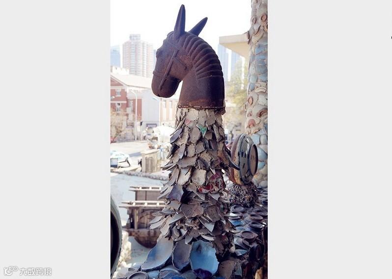 瓷房子小平台的屋顶,又各式各样的盘子装饰,其中最中间的彩粉盘子产自清朝乾隆年间,是张连志花了300万拍来的。