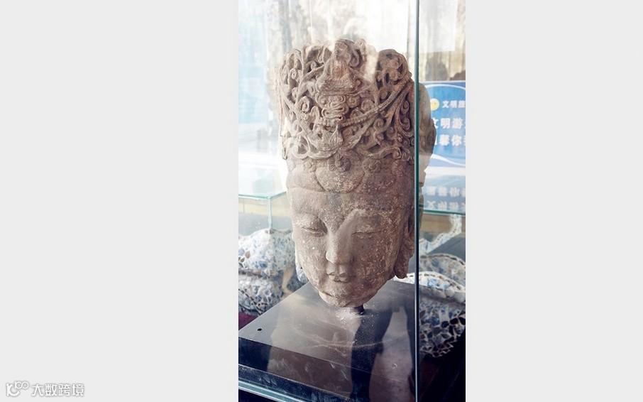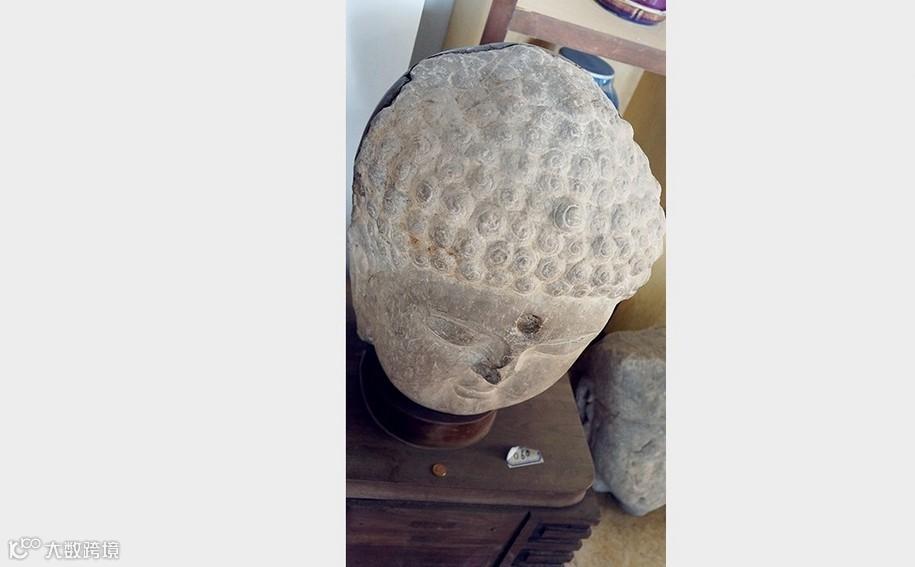 图为房子内展出的一个约1600年前的佛头雕刻,价值约为1.5亿元。