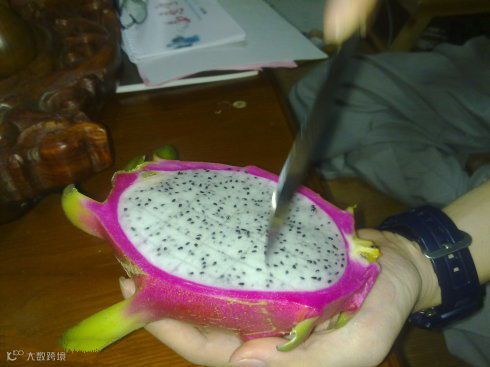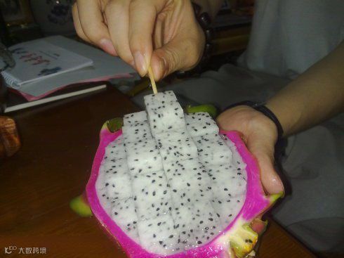 用刀在火龙果的中间如切豆腐般横竖划开,注意别把划破。