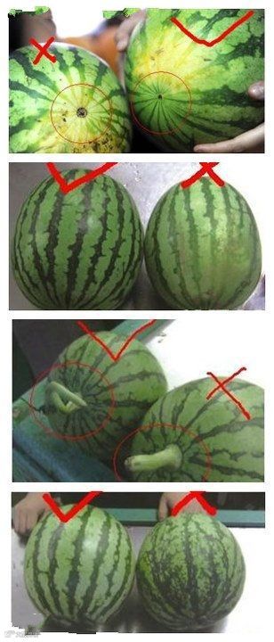 【西瓜的选法】第一,西瓜底部的圈圈,越小越好,相反的,底部圈圈越大,皮越厚,越难吃:第二,颜色最好挑青绿色,不要雾雾白白的。第三,西瓜纹路整齐就是好瓜:第四,西瓜头,就是所谓的蒂头,若是直直的一条线,就不要,但若是卷曲圈起来的,就很甜。