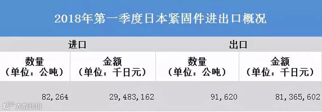 据日本财务省贸易统计数据,2018年第一季度日本紧固件进口数量达到82,264公吨,相比2017年同期下降0.76%;进口总价值约294.83亿日元,相比去年同期增长8.33%。截止2018年3月底,日本紧固件出口数量为91,620公吨,同比上升4.91%;出口总价值约为813.66亿日元,相比去年同期增长3.62%。