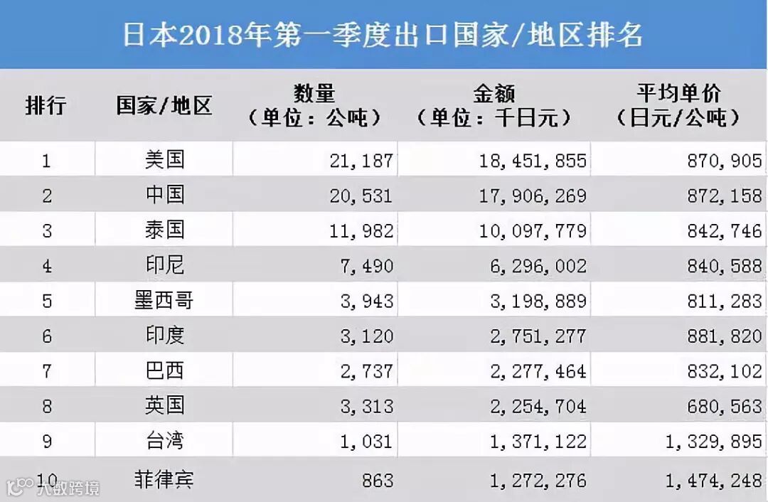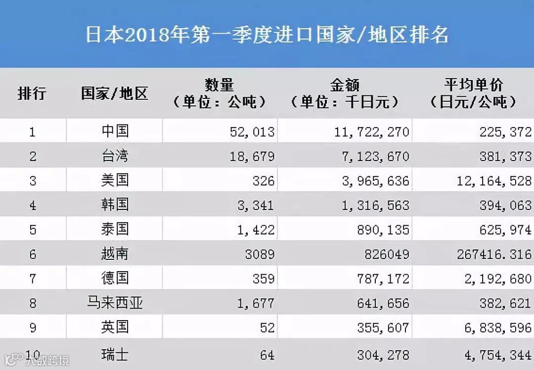 位列今年第一季度日本进口金额的前三名的国家(或地区)分别是中国、中国台湾及美国。虽然日本从韩国进口的数量位于第三,但由于单价(394,063日元/公吨)远低于美国(12,164,528日元/公吨),因此总金额远低于美国的39.66亿日元。同样的,中国的金额虽然位于第一位,但可以看出,这是由于数量上的优势,平均单价上仍是前十国家(或地区)中最低的。