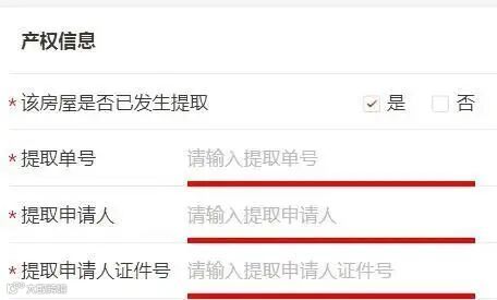 选择“该房屋是否已发生提取”,若选择“是”则录入该套房的申请单信息:提取单编号、提取申请人(姓名)、提取申请人证件号,录入并校验通过后,自动关联该提取单并带入已有的产权信息;