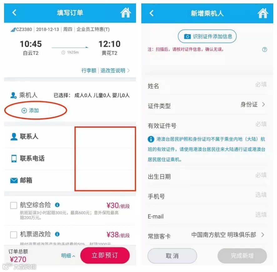 4、点击预订后,点击乘机人添加新增乘机人(只有通过审核的注册人及注册亲属才能享受企业员工特惠价格),并填写联系人等相关信息完成预订。