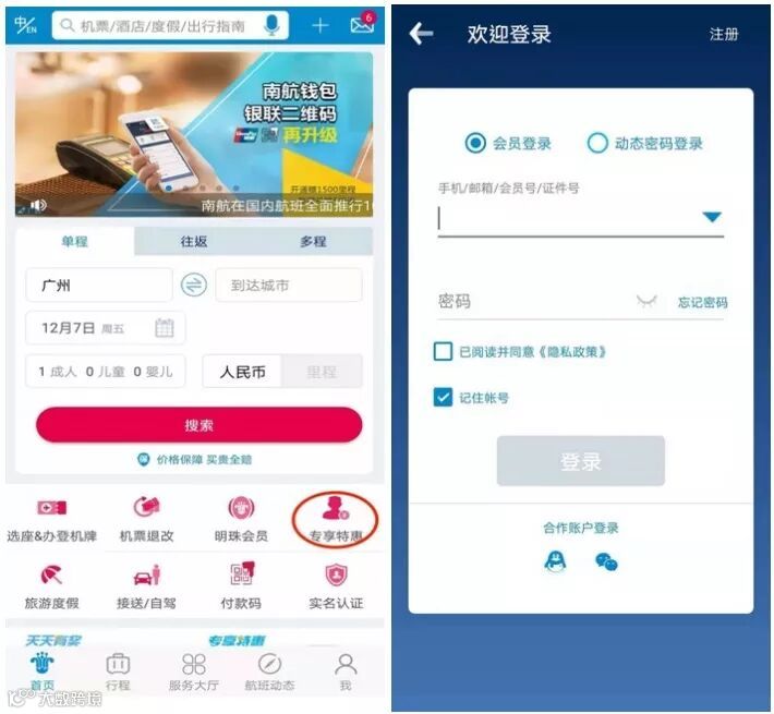 1、下载南航官方APP(“南方航空”),打开APP点击首页的专享特惠,在弹出的登录界面使用会员登录方式登录。目前专享特惠机票仅支持会员登陆购票,请勿使用动态密码登陆。