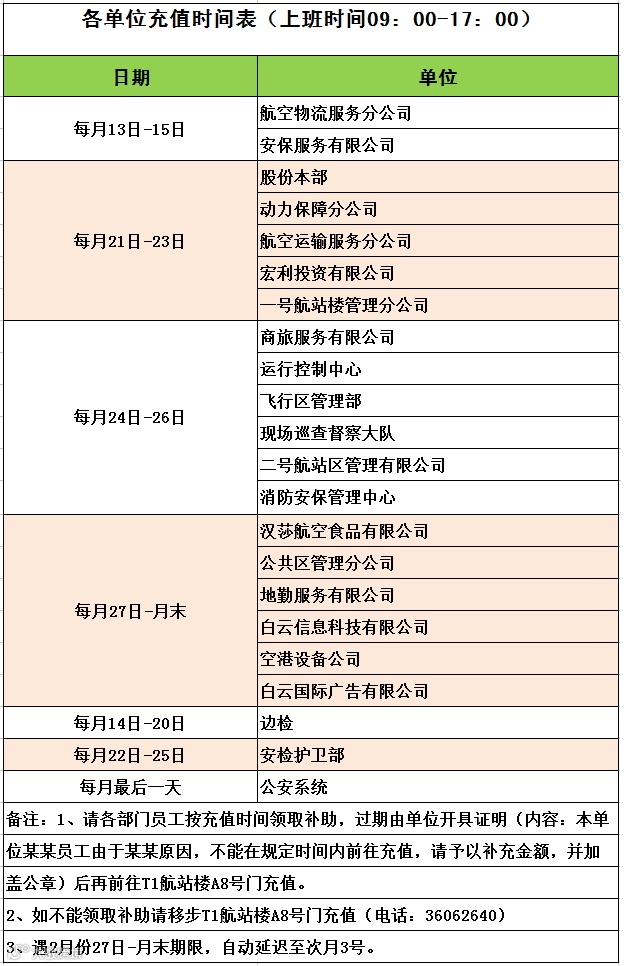 2、遇节假日时间,请各位同事前往T1航站楼A8号门进行充值补助操作。