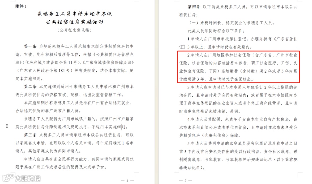 根据《来穗务工人员申请承租市本级公共租赁住房实施细则》(公开征求意见稿)暂未实施,仅供参考,其中要求申请人在广州地区参加社会保险(含广东省、广州市社会保险,社会保险的内容包括基本养老、职工社会医疗、工伤、失业和生育保险,下同)连续缴费(含补缴)满2年或者5年内累计缴费满3年,且申请时处于在保状态。