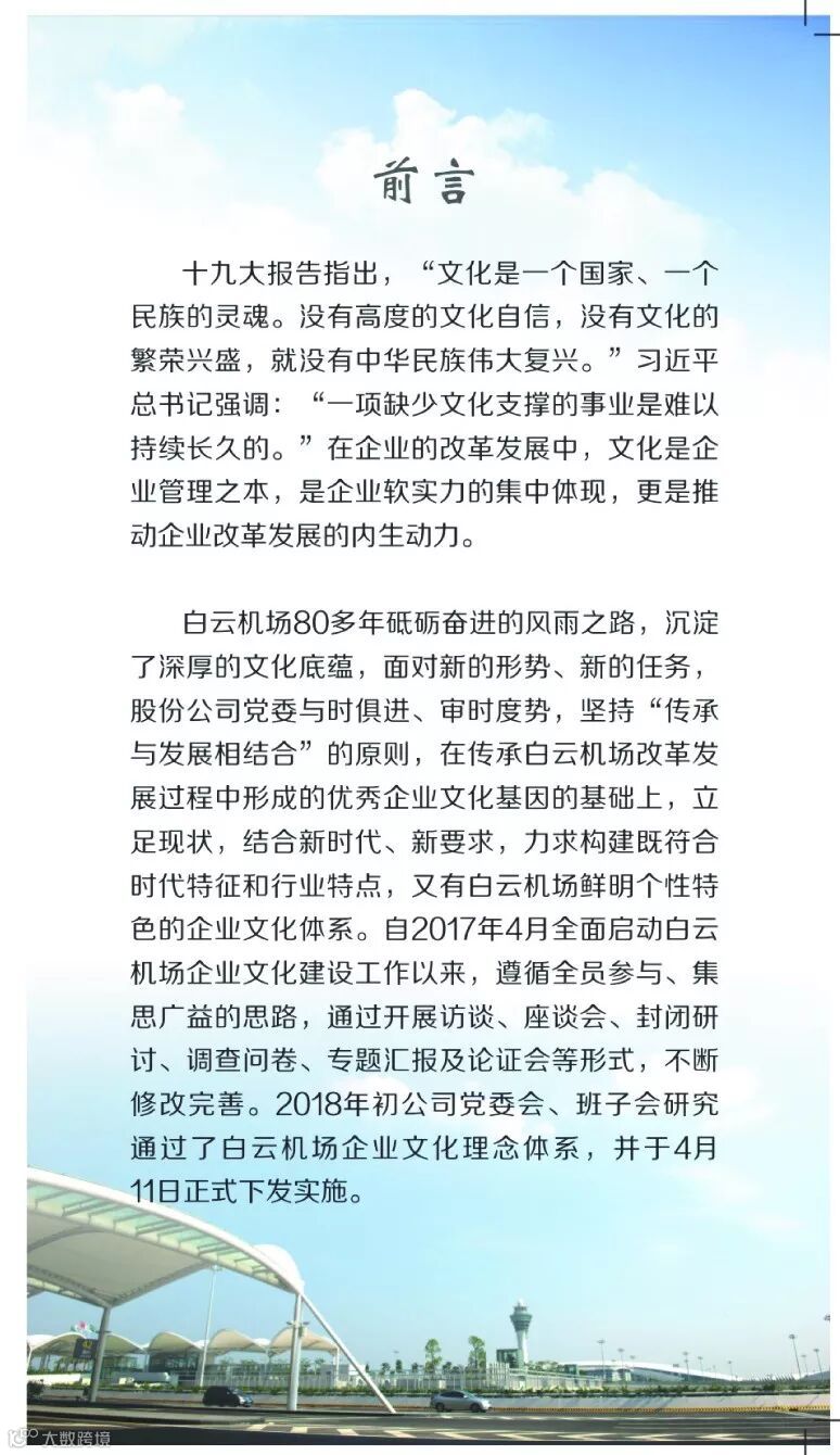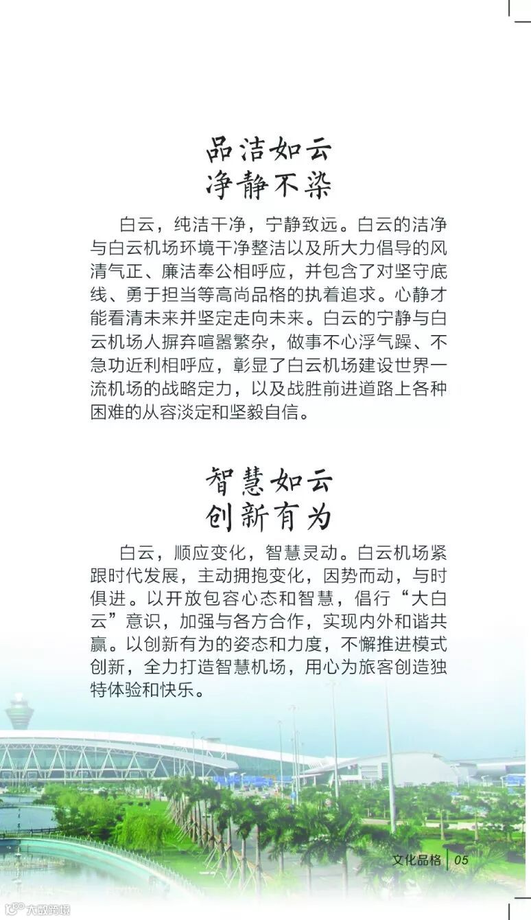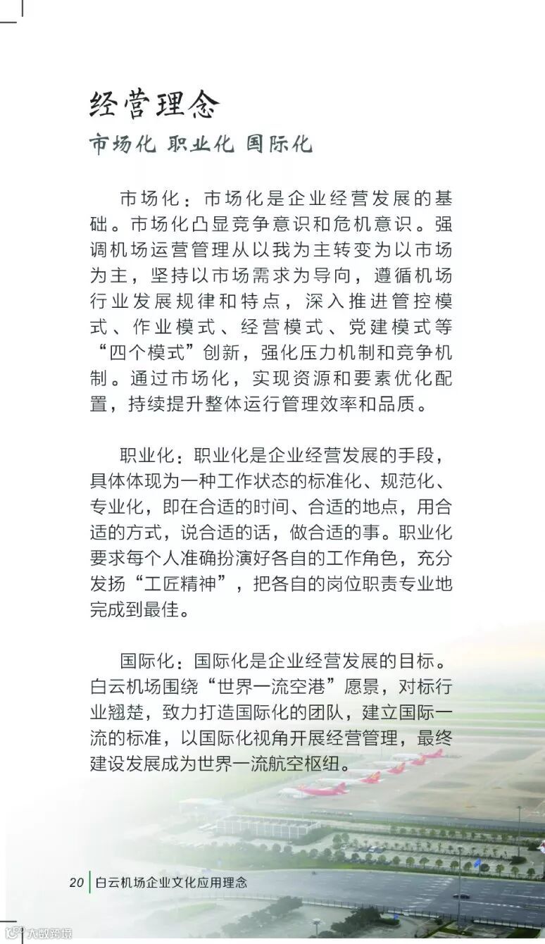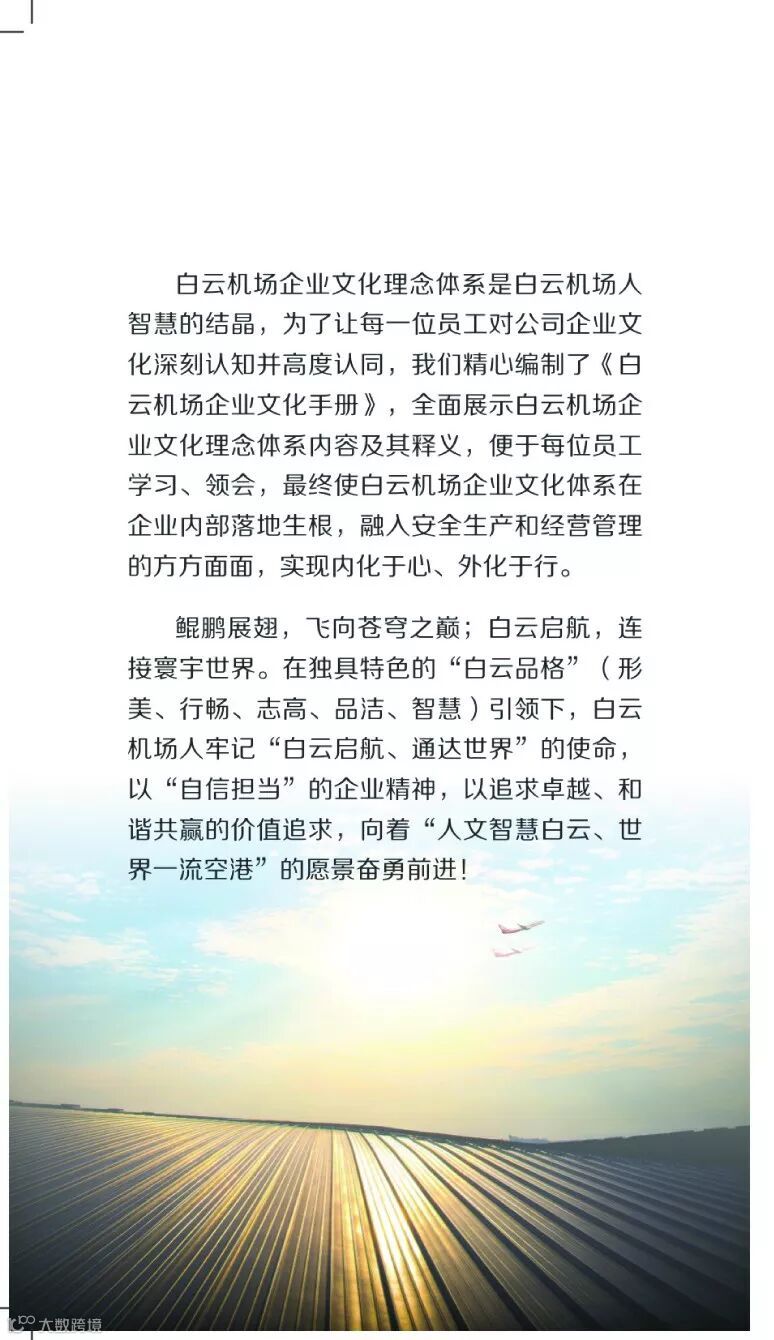 白云机场企业文化理念体系于2018年4月11日正式下发实施,该体系凝结了白云机场人智慧的结晶,为了让每一位员工对公司企业文化深刻认知并高度认同,公司精心编制了《白云机场企业文化手册》,便于大家学习领会。