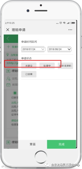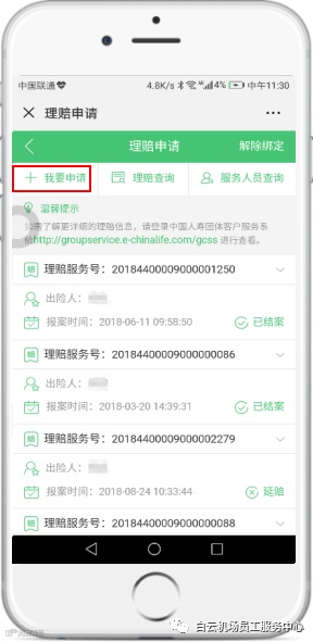 点击理赔查询可按照申请日期及案件状态查看申请记录