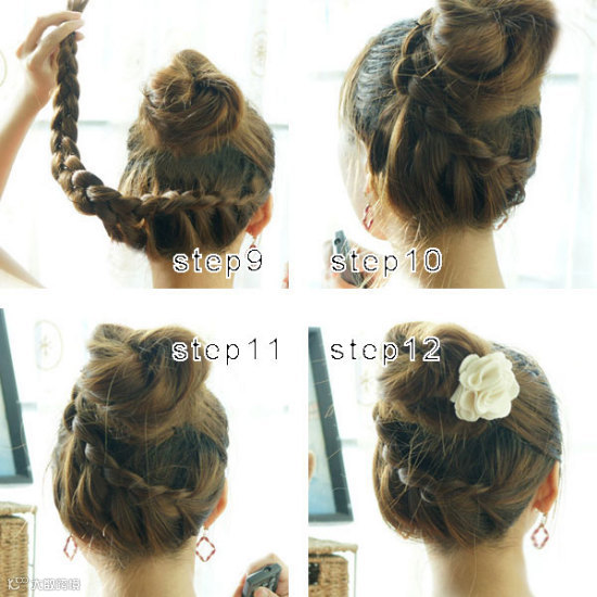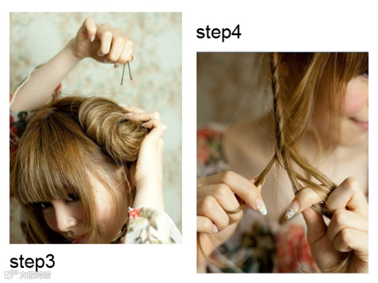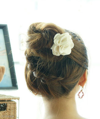 用编好的麻花辫绕花苞一圈,并用发卡固定好,这款美美的韩式可爱花苞头就完成了。