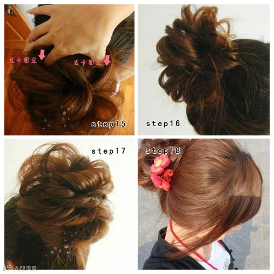 发尾的头发用梳子打毛,如果你是烫发也可以用手撕扯的方式把头发弄的更加的蓬松,然后顺时针旋转让头发呈花苞妆,并用卡子固定好。