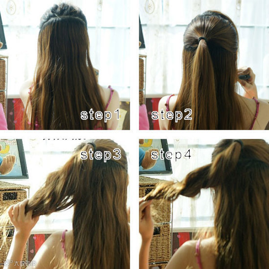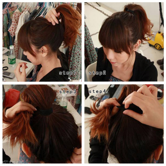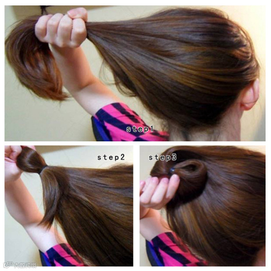 把头发高高梳起马尾,从马尾的发尾开始向内卷起。