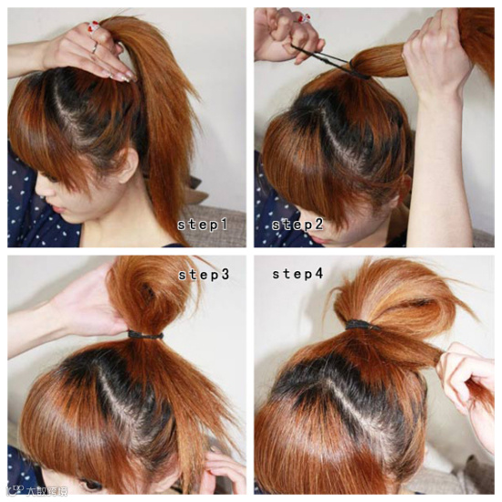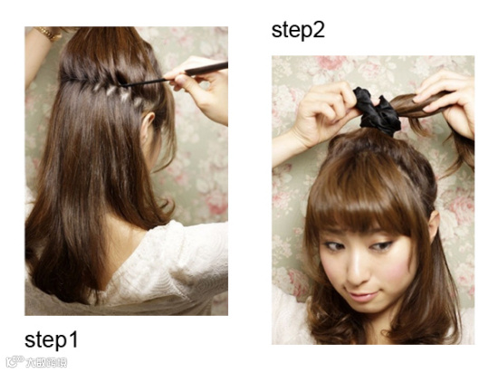 把头发高高的梳起一个马尾,并握起一个拳头大的发箍,用皮筋固定,然后把马尾上的头顶中间部分的头发挖一个小洞。