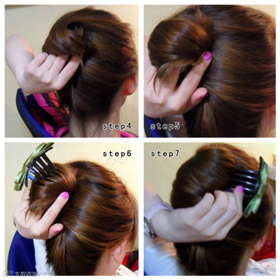 用靠近发色的棍卡把拧好的头发固定好,这样这款美美的韩式盘发就完成了。