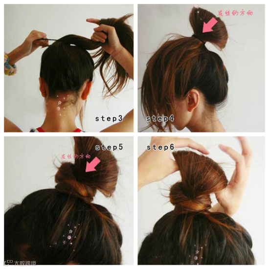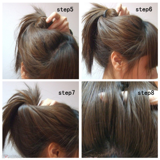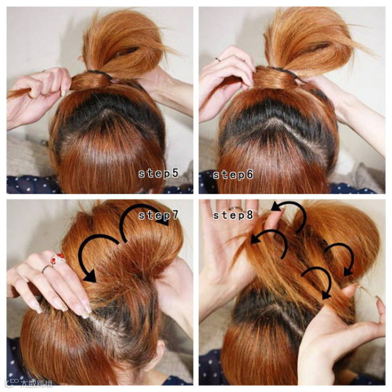 把剩余发尾的发丝顺时针绕在马尾根部固定好。握起头发的部分向前后左右四个方向拉开。