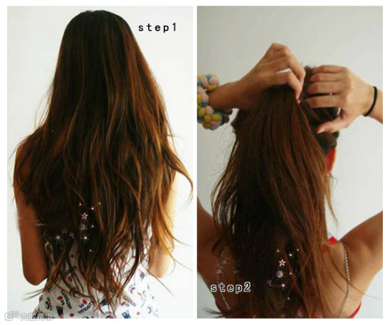 长发MM要盘发,发量有多,可能点费力气,下面看这位长发MM是怎样把头发盘的美美的,高高梳起一个马尾,有皮筋固定。