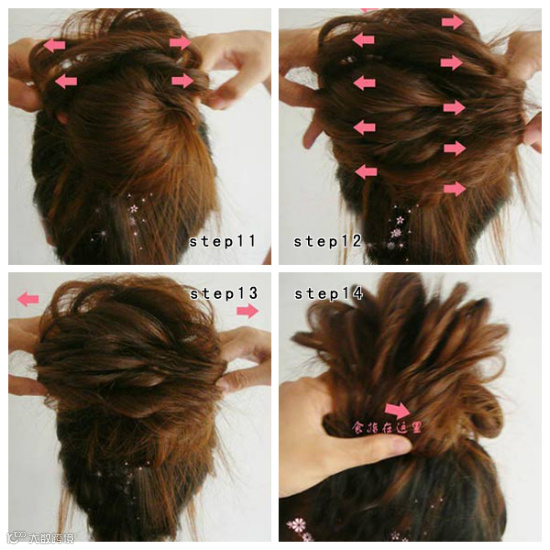 把后面的头发按图片箭头的方向拉成花的形状,让头发看起来更加的蓬松。