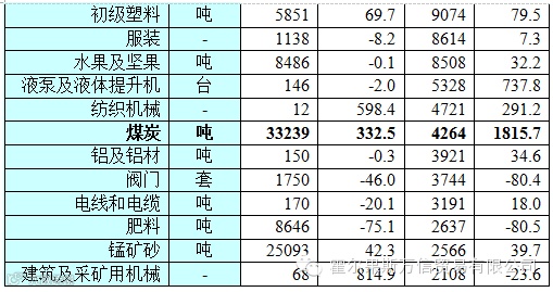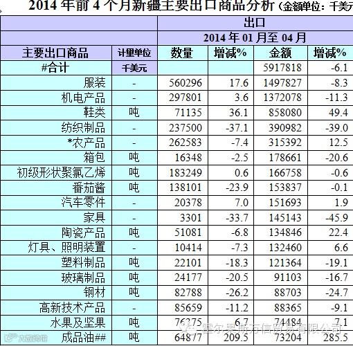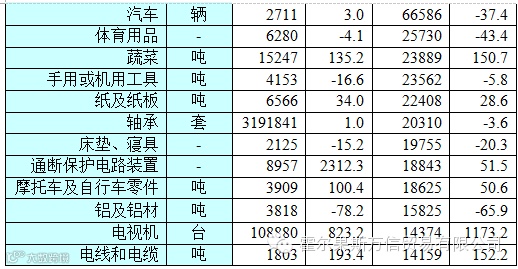 (六)大宗商品出口减少。鞋类、农产品、汽车零件、陶瓷产品、灯具、成品油出口分别增长49.4%、12.5%、1.9%、22.4%、6.6%和1.86倍。服装、机电产品、纺织制品、箱包、家具等出口额分别减少8.3%、11.3%、39%、20.6%和45.9%。