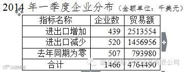 一季度,有业绩的1466家企业中,进出口增加的企业439家,贸易额合计25.13亿美元,占全区进出口总值的52.75%。去年同期业绩为零的企业507家(部分是今年新注册企业),贸易额7.94亿美元。同时,去年有业绩,而今年同期业绩为零的企业525家。