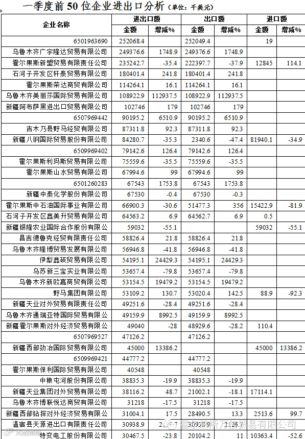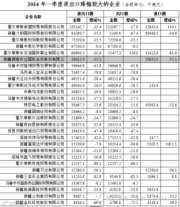 部分大企业业绩下滑。一季度,进出口同比下降的企业526家,占企业数的35.5%。贸易额合计14.57亿美元,占全区进出口总值的近三分之一,其中不少是自治区的大企业,如:新疆八钢国际贸易股份有限公司,下降35.3%;霍尔果斯中石油国际事业有限公司,下降30.6%;乌鲁木齐隆博贸易发展有限公司,下降41.8%;新疆霍尔果斯对外经济贸易有限公司,下降28%;中粮屯河股份有限公司,下降19.9%;特变电工股份有限公司,下降23.8%;新疆三宝实业集团有限公司,下降82.8%;新疆金风科技股份有限公司,下降69.6%。这些大企业进出口的大幅下滑,是导致我区外贸整体下降的主要原因。