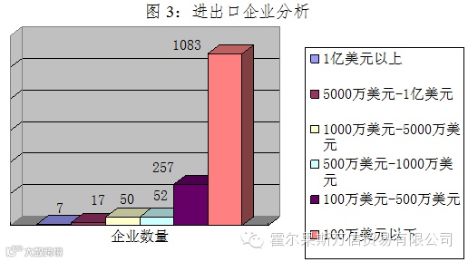 按企业贸易额划分,进出口额在1亿美元以上的企业7家,进出口额在5000万美元至1亿美元的企业17家,进出口额在1000万美元至5000万美元的企业50家,进出口额在500-1000万美元的企业52家。