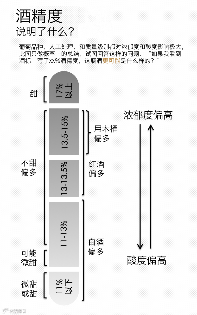 只要根据酒标上酒精度标示,再配合此图,那么下次小伙伴们在选酒的时候就能对酒质有个八九不离开十的大概了解了。