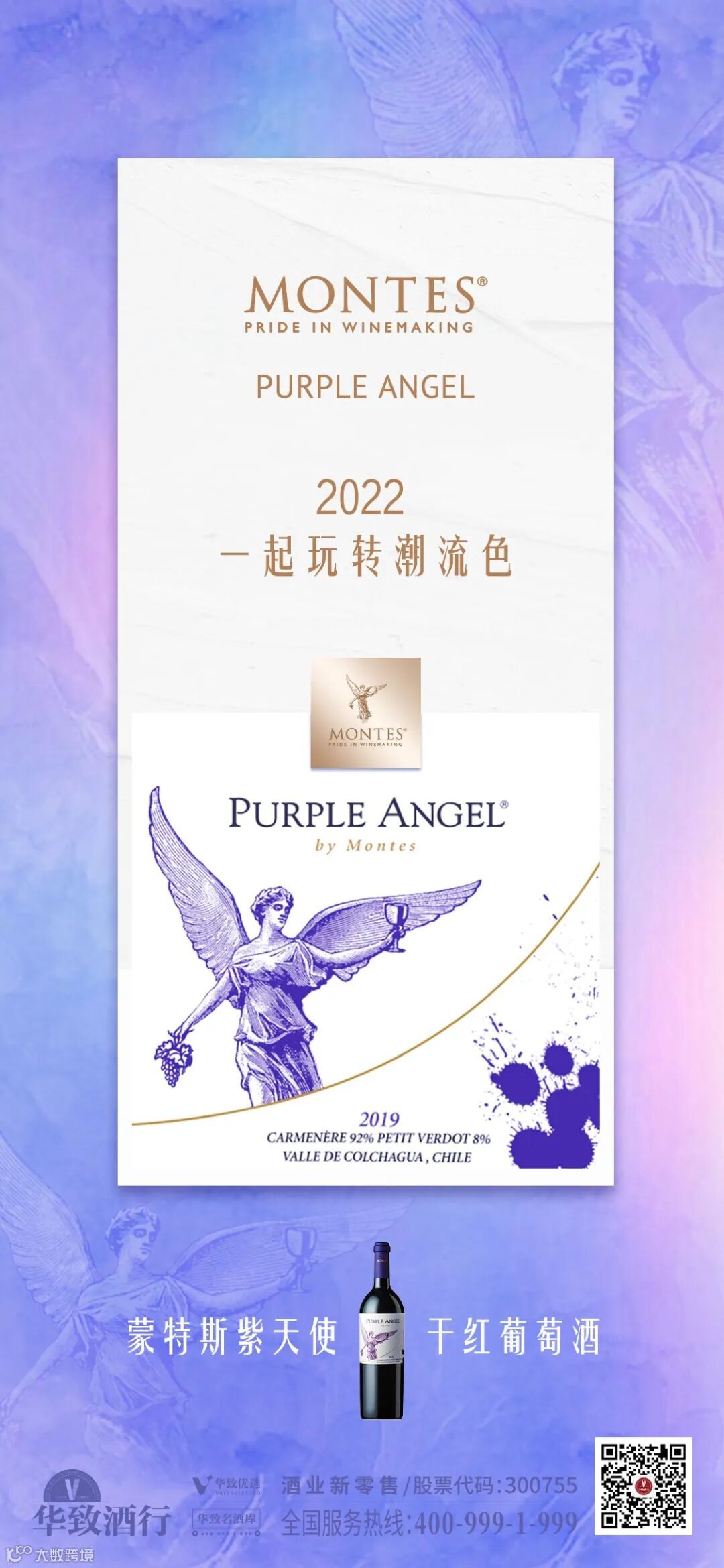 蒙特斯紫天使干红葡萄酒获国际殊荣无数,热销全球110个国家,同时也是智利国宴用酒。梦幻的长春花蓝色酒标和智利葡萄酒荣耀的搭配,令人怦然心动。