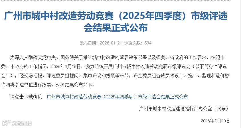本次劳动竞赛由广州市住房和城乡建设局牵头组织,是对城中村改造项目综合实力的权威认证。竞赛聚焦纳统纳税、智能建造、安全文明施工、质量管理、协同履约等多个维度,对全市城中村改造项目展开综合评比,充分调动广大参建单位的积极性、主动性和创造性,将高质量发展理念贯穿于城中村改造项目建设管理的全过程,按时按质按量完成城中村改造工作各项目标任务。