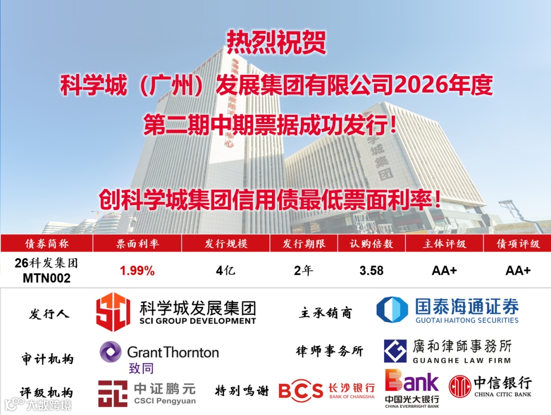 3月24日,发展集团成功发行2026年度第二期中期票据(债券简称:26 科发集团 MTN002)。本期债券由国泰海通证券担任主承销商,发行规模4亿元,期限 2年,全场认购倍数达3.58倍,票面利率锁定1.99%,一举创下科学城集团信用债发行利率历史新低!