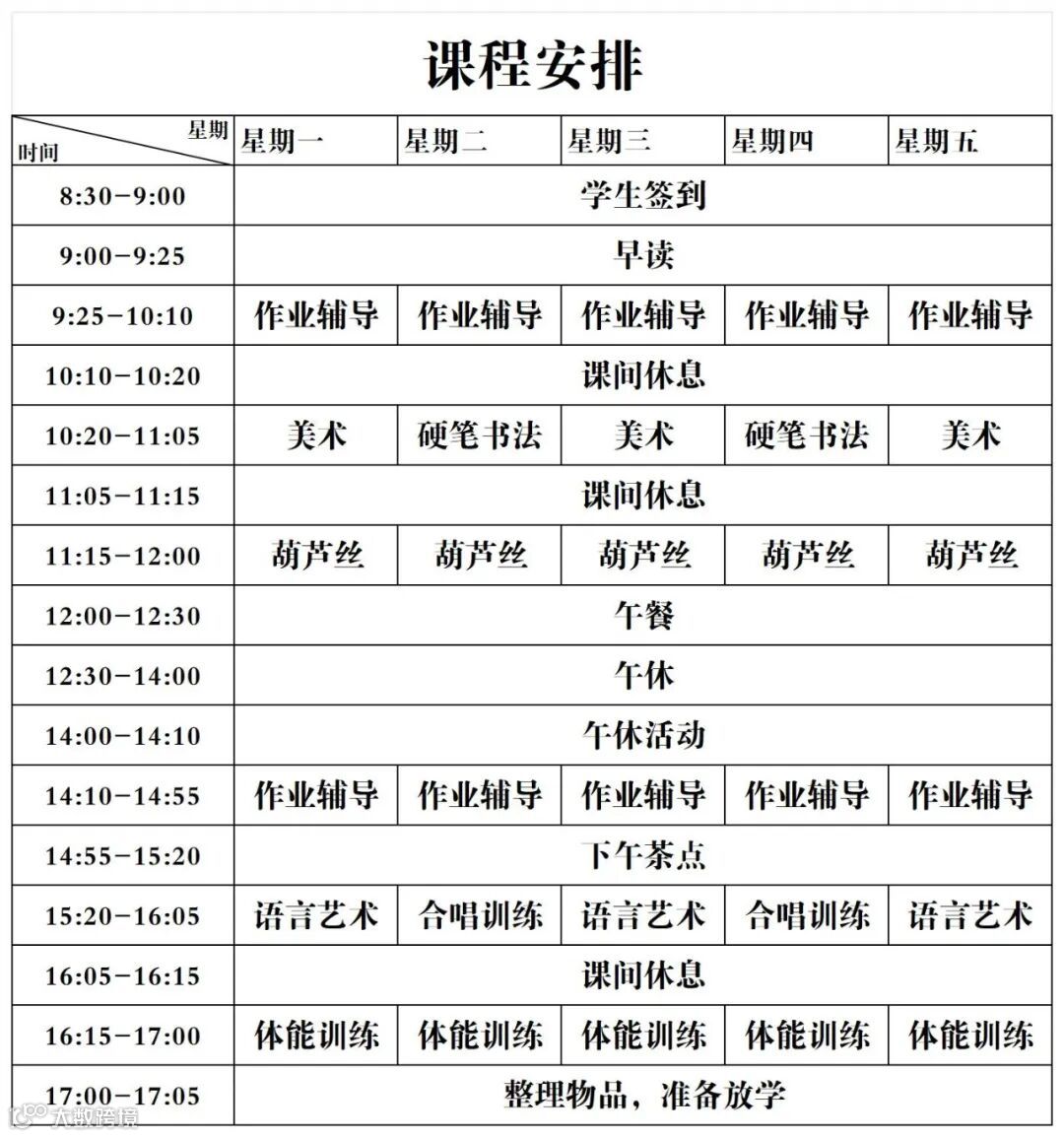 以上费用包含:托管费、艺术课程费、中午餐费、下午茶点