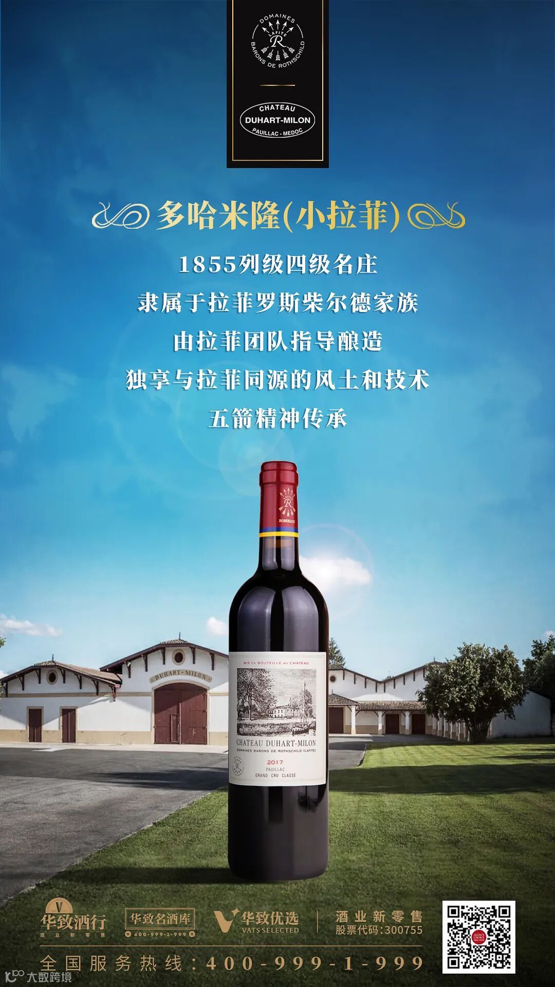 多哈米隆古堡红葡萄酒(Chateau Duhart-Milon, Pauillac, France),它被认为是最具波雅克特性的佳酿之一,通常使用65%-80%的赤霞珠和20%-35%的梅洛进行酿造,口感紧密扎实,具有高雅而内敛的个性,年产量为22,000-25,000箱。