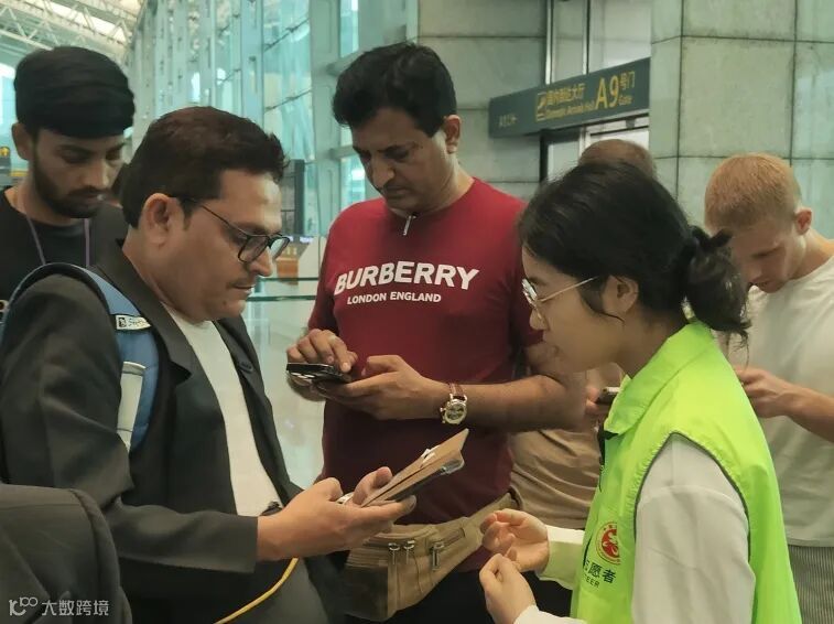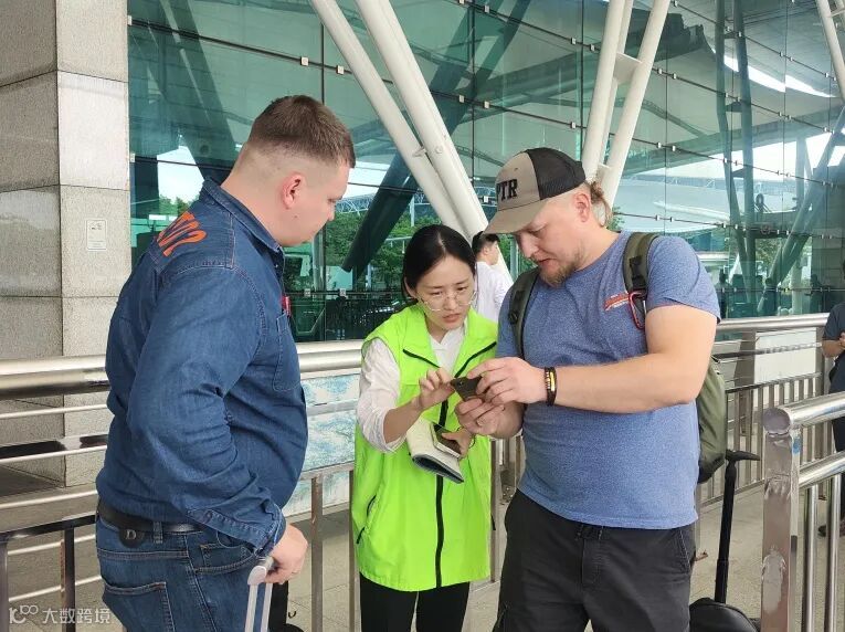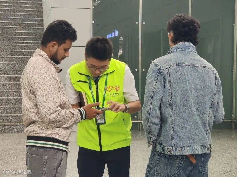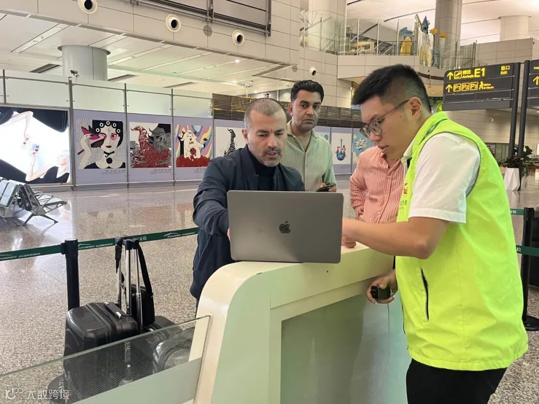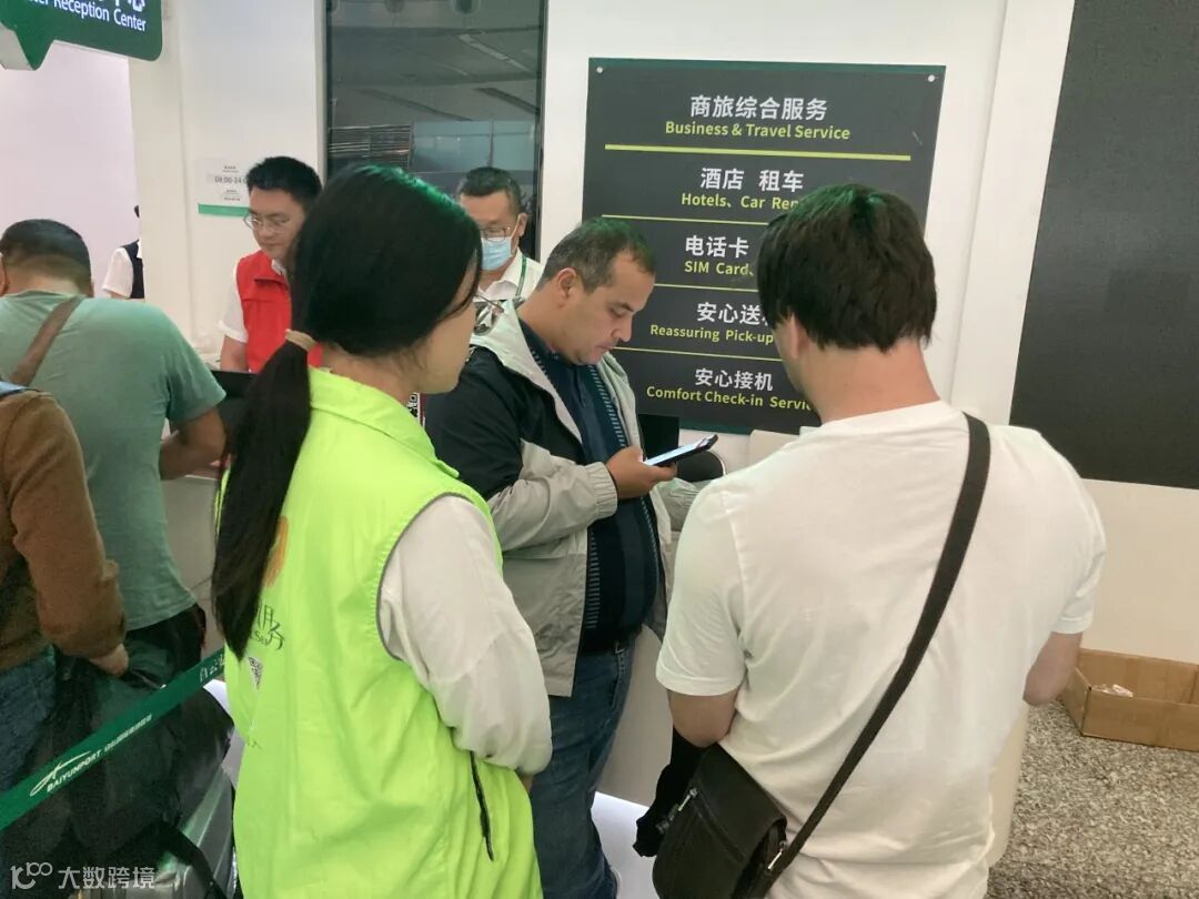 在证件办理服务点,管培生志愿军协助商客连接机场wifi,并完成广交会商户账号的注册和办证申请。下午16:00-18:30期间,该点位共计服务81人次,其中,中东36人、非洲18人,欧洲13人,中亚10人、南美3人、东南亚1人。