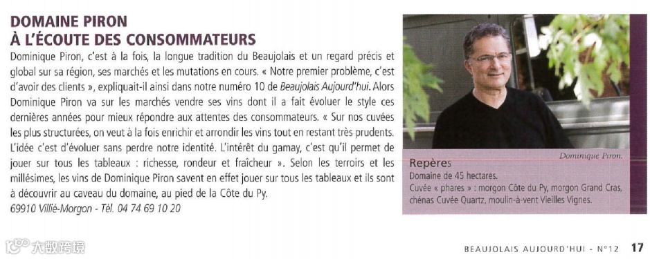 《BEAUJOLAIS TODAY》杂志对多米尼克•皮龙先生的介绍