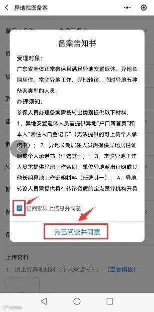1. 微信搜索“粤医保”小程序,进入小程序后选择“异地就医备案”,并阅读“备案告知书”,点击“我已阅读并同意”。