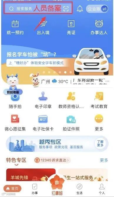 1. 下载“穗好办”APP。打开后在“首页—热门服务”进入“异地就医备案”专栏,也可以在搜索栏输入“人员备案”,进入后点击“更多”,找到对应的备案类型。