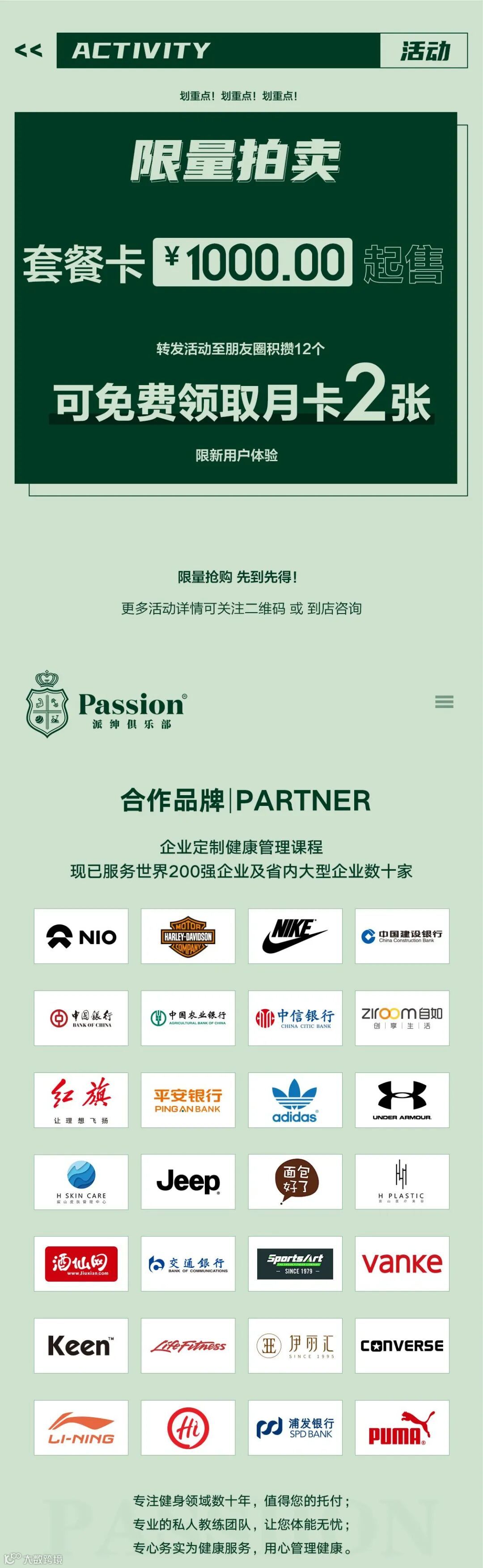 Passion健身俱乐部,源自欧洲贵族生活:讲究、精致、细腻,舒适细腻的运动的空间,全进口器械intenza的有氧设备和力健的力量设备完美搭配让您感受高端器械带来的舒适体验,让会员切身体会一流的健身环境,国际专业的健身概念。