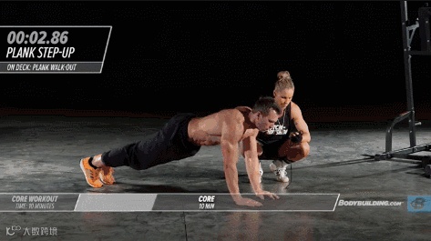 动作要领:呈标准平板撑姿势,然后一只手掌撑地,撑起一边身体,直至手臂伸直,紧接着另外一只手做同样动作,双臂撑直后,按动作顺序返回标准平板撑姿势,重复进行。