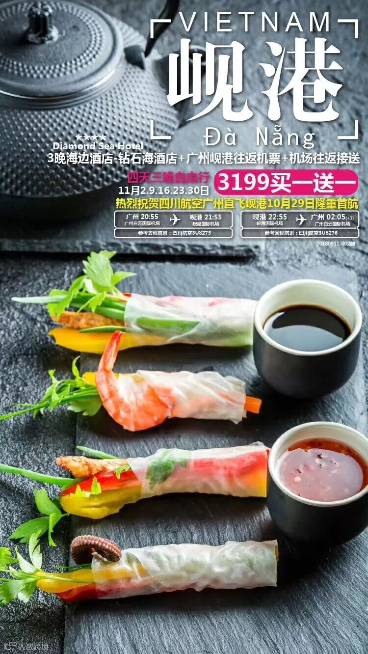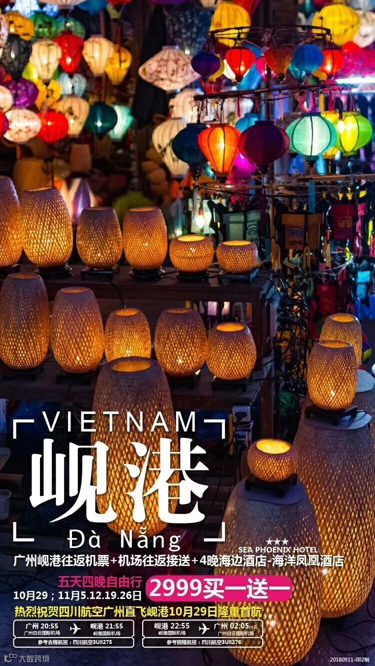 航班时间:(广州)20:55-(岘港)21:55,(岘港)22:55-(广州)02:05