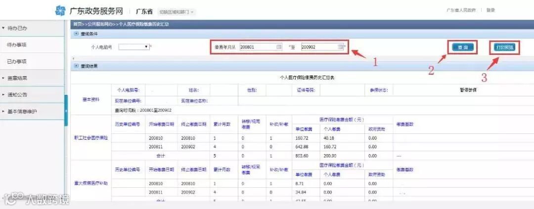 1.登录“广东政务服务网”。(网址:http://www.gdzwfw.gov.cn),搜索“个人缴费历史打印”事项。(搜索范围选择“广州市”,办理部门选择“广州市医疗保障局”)