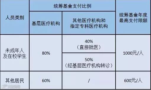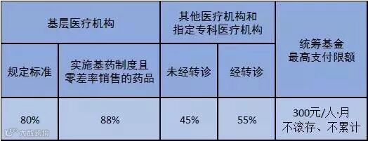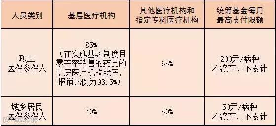 tips:家庭病床按一级定点医疗机构住院的支付比例,其余门诊特定项目的统筹基金支付比例与对应级别的住院支付比例一致。
