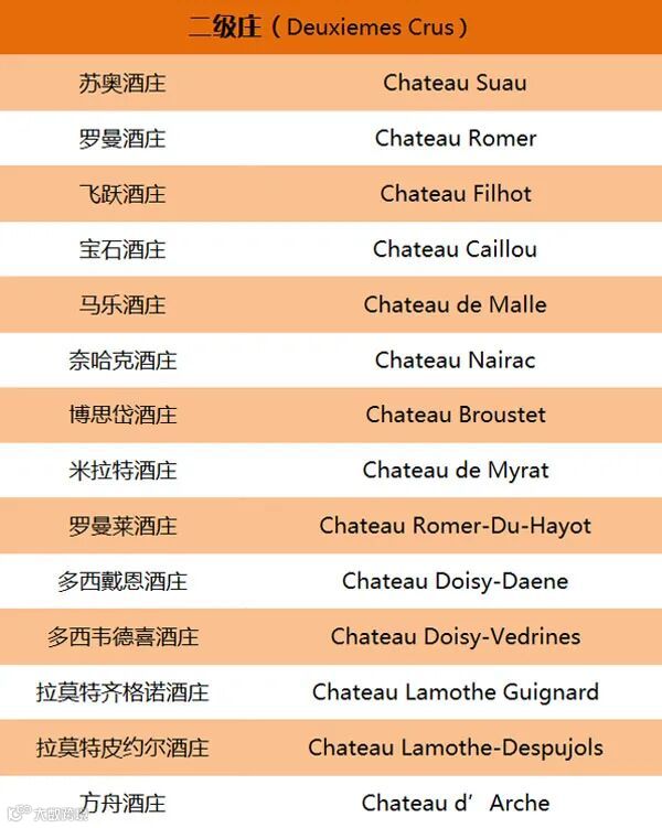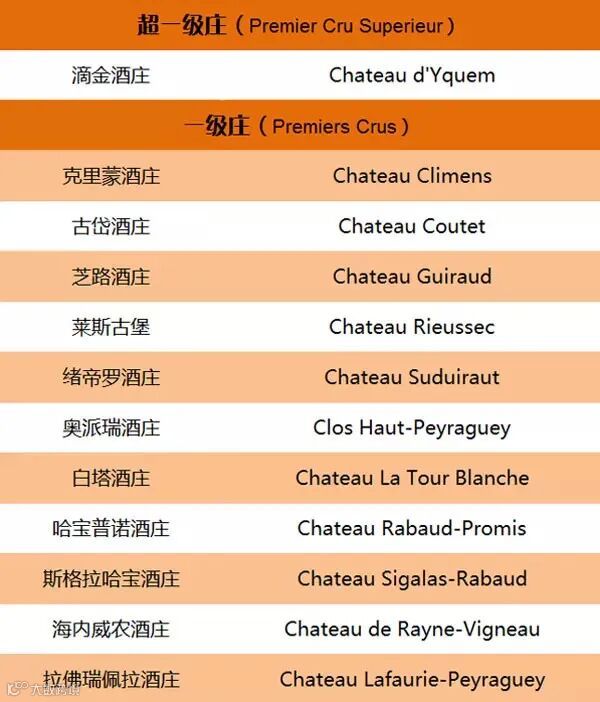 2)1855 年苏玳和巴萨克分级:将甜白葡萄酒酒庄最终分为三级,即超一级、一级和二级酒庄,共有 26 家酒庄入选。