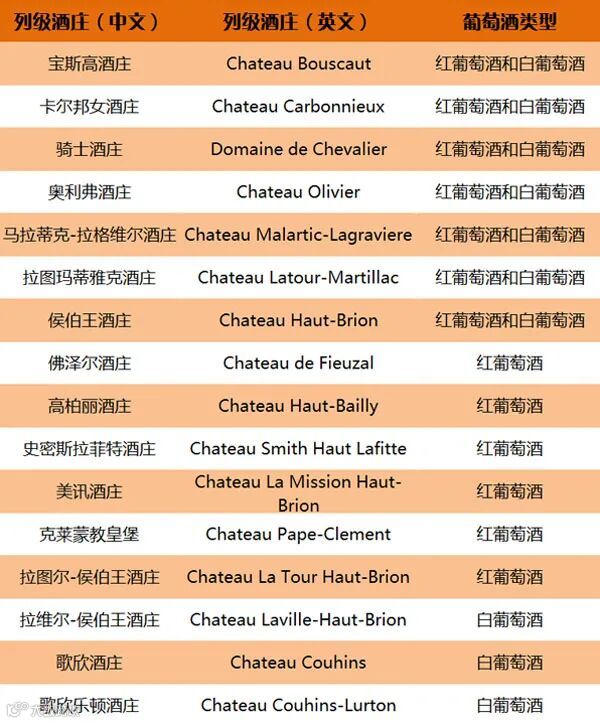 1959年,经过修订的格拉夫分级制度正式确立。在最终公布的官方名单中,共有16座列级庄入选。其中红白葡萄酒双栖的有6座,仅红葡萄酒入选的有7座,仅白葡萄酒入选的有3座。