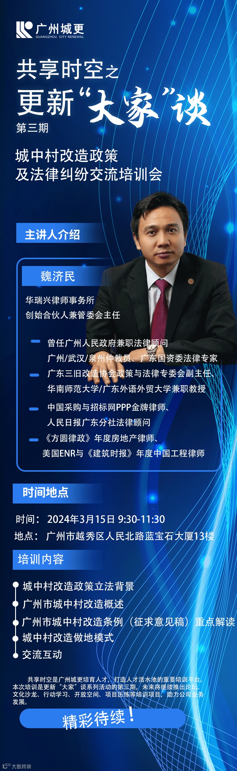 3月15日,广州城更成功举办第三期共享时空之更新“大家”谈系列主题培训活动,本次培训邀请具有多年城中村改造项目经验的华瑞兴律所创始合伙人魏济民律师作《广州市城中村改造政策解析》主题培训。广州城更副总经理吴家友及相关业务团队参加活动。