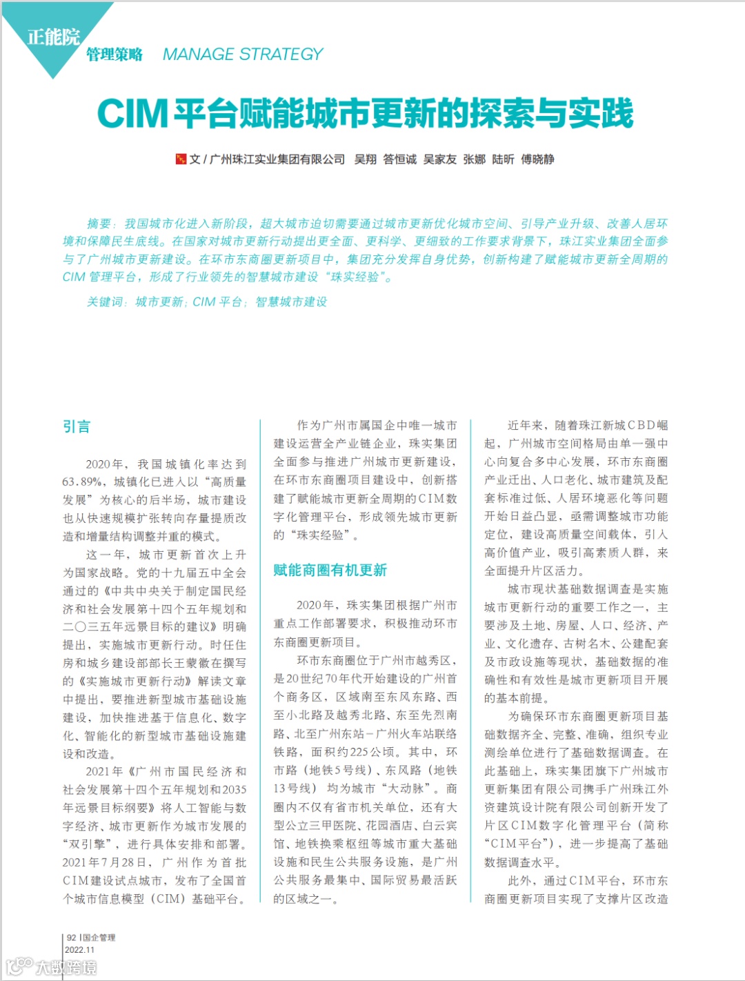 广州城更一直秉承利用科技创新推动城市更新。2020年,广州城更结合环市东项目,联合珠江设计共同研发了环市东CIM平台,该平台集片区改造成本核算、居民改造意愿征询、拆补方案可视化、安置房智慧设计和项目档案数字化等五大功能为一体,为城市有机更新提供信息化、数字化和智能化管理支撑,能显著提升城市更新工作质量和效率。近日,《CIM平台赋能城市更新探索与实践》一文在《国企管理》杂志2022年11月号刊发。该篇文章分享了珠实集团在参与广州城市更新工作过程中,以环市东项目为试点,积极发挥自身资源优势,创新构建城市更新项目CIM管理平台,赋能城市有机更新和智慧城市建设的“珠实经验”。