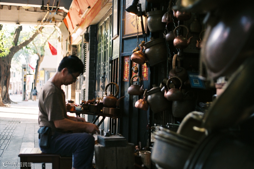 夏日午后,走在恩宁路的骑楼下,远远便可听见“叮叮当当”的打铜声。打铜匠坐在店门口的小板凳上,手里拿着扁锤,敲着羊城最后的打铜声,延续着这一传统的手工技艺。