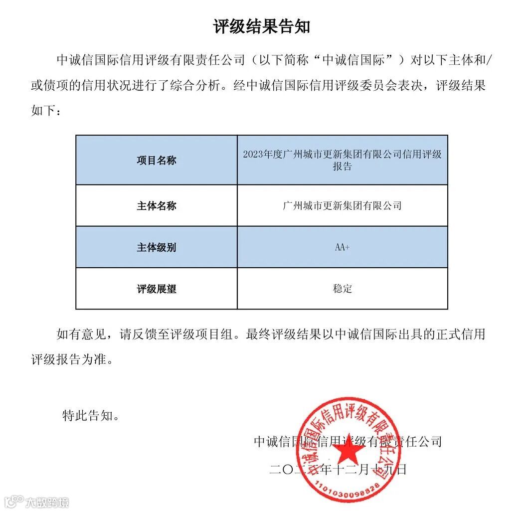 近日,经国内权威机构中诚信国际信用评级有限公司评定,广州城市更新集团有限公司荣获AA+主体信用评级,评级展望为稳定。公司将以此次评级提升为契机,进一步发挥市属国资城市更新平台优势,提高融资能力,拓宽融资渠道,降低融资成本,为城中村改造工作导入金融“活水”,为广州城市更新高质量发展贡献国企力量。